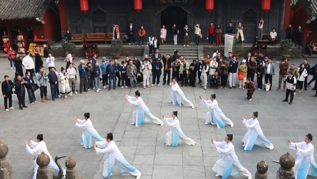 主播在湖北十堰武当山观看武当太极表演